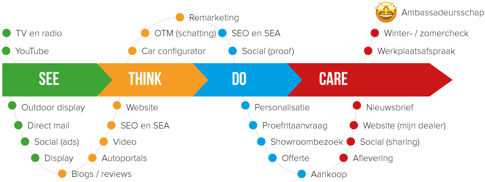 In de customer journey voor de automotive branche zijn er veel touchpoints te onderscheiden. Het is belangrijk om alle touchpoints, contactmomenten en kanalen in kaart te brengen en deze te visualiseren. De customer journey voor de nieuwe auto of een occasion verschillen behoorlijk en het is daarom raadzaam om deze uit te splitsen. Daarnaast bestaat een customer journey uit verschillende fases, hieronder nemen we je mee in de vier verschillende fases (see, think, do en care) van de klantreis.